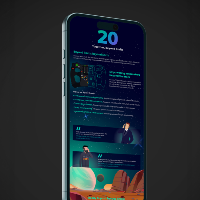 20 años de colaboración dan para mucho. Siemens es el partner tecnológico que ha acompañado a Red Bull Racing desde sus inicios, impulsando cada reto con ingeniería de vanguardia. Para celebrar estas dos décadas juntos, desarrollamos una campaña global con un vídeo rodado en Reino Unido y España, con desarrollos 3D, narrativa y una escena final inolvidable: un circuito de Fórmula 1 en Marte. El claim, Together Beyond Limits, lo resume todo. Una historia real de innovación, ambición y velocidad compartida.